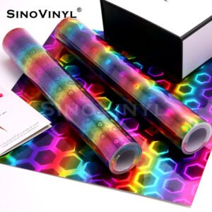 SINOVINYL’s Laser Rainbow Colorful Self Adhesive Vinyl is a top choice. This vinyl is perfect for use in digital and UV printing, as well as for vehicle advertising. Its gloss laser rainbow surface is eye-catching and adds a touch of vibrancy to any project.
