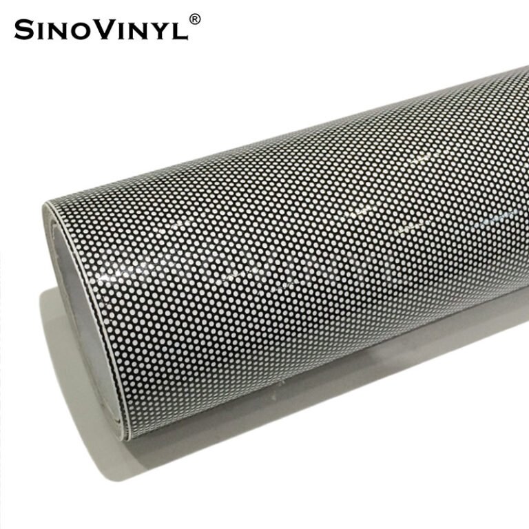 Our one way vision with a lot of round holes on the surface,suitable for pasting on glass,with a translucent effect,specially used for shopping malls,glass wall and bus windows,waterproof and sun protection.